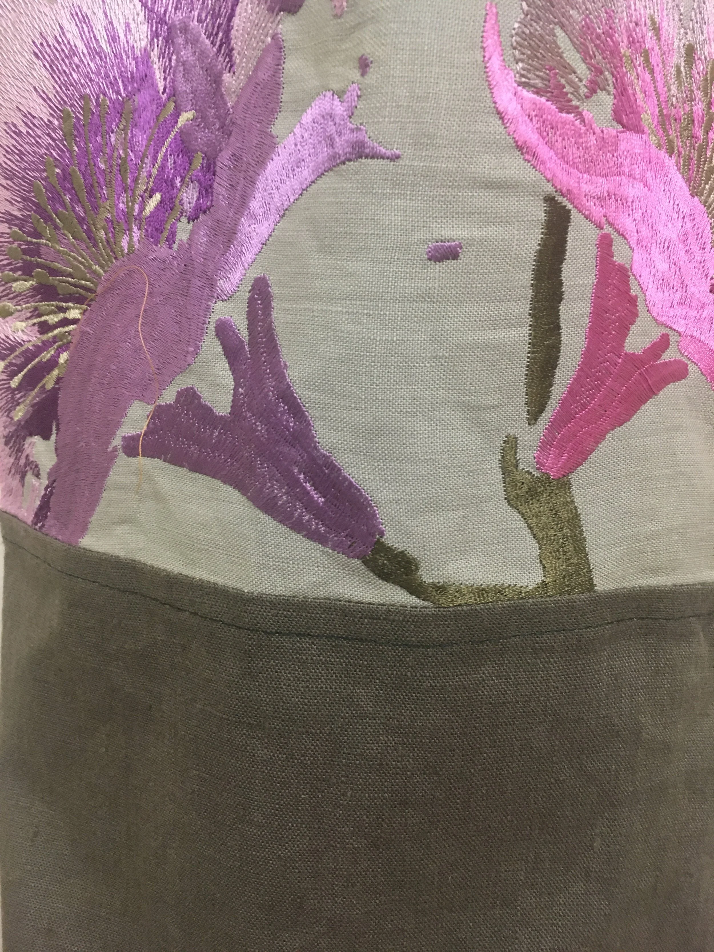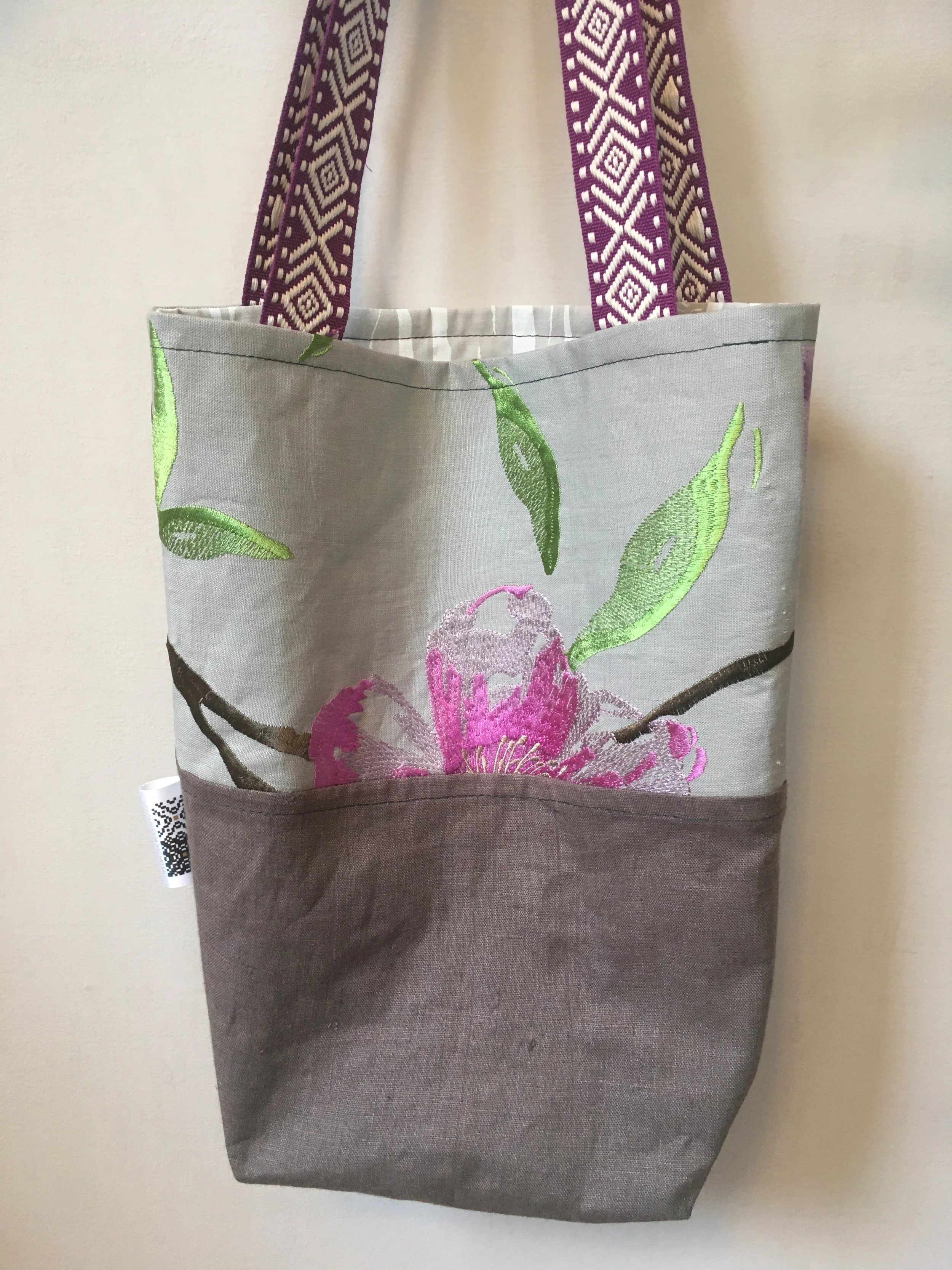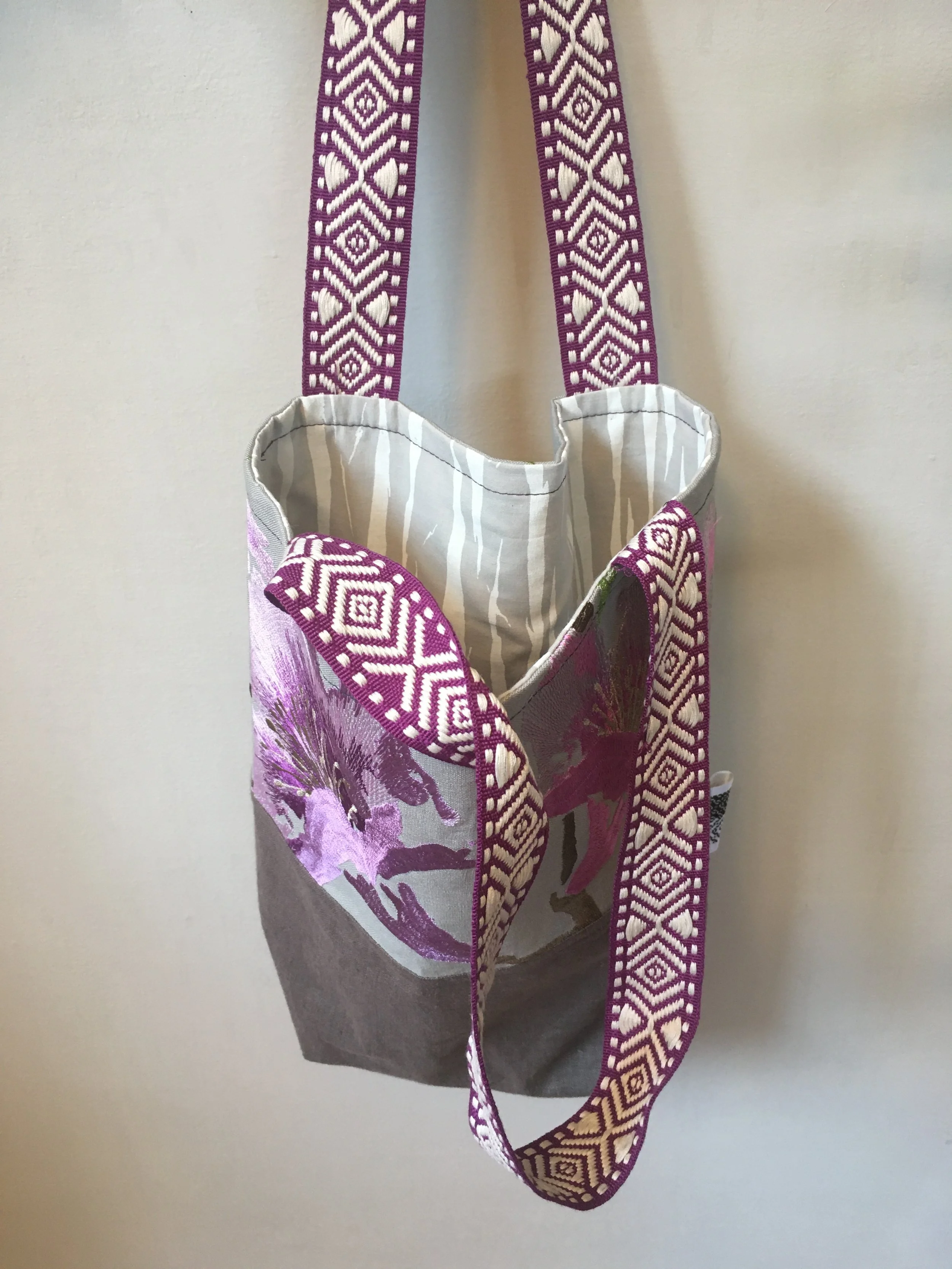 This patchwork tote of shopping bag features colorful pieces of fabric from my stash of luxurious upholstery fabrics with touches of embroidery. It has a fine striped cotton lining and a sturdy leather strap.